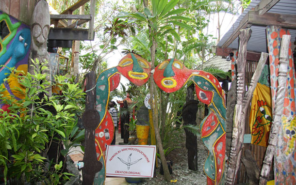 Посетили мы и усадьбу Мишутушкина и его друга, местного художника меланезийца Алои Пилиоко. Удивительное ощущение испытываешь, входя в огромный тропический сад. Дорожки, уставленные искусно вырезанными из дерева скульптурами, ведут к дому на берегу океана. В саду и дома собрана богатая коллекции прикладного искусства народов Океании, яркие и уникальные по стилю картины Николая и Алои, которые художники часто подписывали одним именем NicAloi. Алои показал нам дом, многочисленные холсты, лежащие стопами на столах в комнате. Вспоминал, как в начале