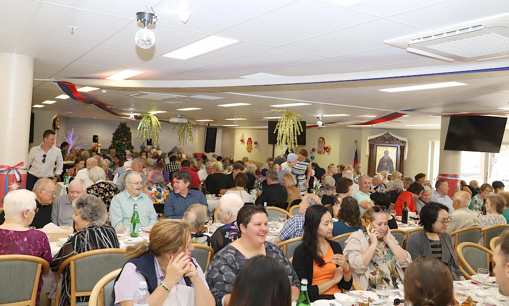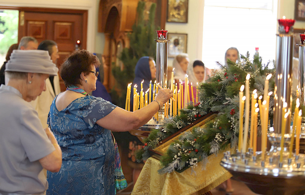 Когда мы подъехали в Петропавловский собор в Стратфилде в 9 утра, служба здесь уже началась, хотя люди все еще подходили и подходили. Рождество в летнее время в Австралии, конечно, отличается от снежного в России, но правление прихода и сестричество постарались, как могли, соблюдать многовековые традиции. При входе в храм стояли две красивые больших зеленых ёлки, еще шесть рождественских деревьев украшали зал. Эти специально заказанные ели были доставлены в храм из леса прямо накануне нашего Рождества. Также еловыми ветками были украшены основные иконы.
