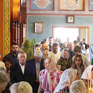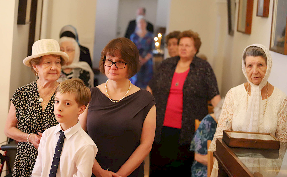 Мы пробыли в соборе около часа и отправились в находящийся неподалеку, в Кройдоне, в Крестовый храм Всех святых в земле российской просиявших, расположенный рядом с епархией РПЦЗ. Здесь литургию служил его настоятель о. Симеон Некипелов и протодиакон Константин Мошегов. Этот храм также был заполнен молящимися. Мы встретили много наших добрых знакомых и читателей «Единения». Храм также был красиво убран к празднику, постаралось сестричество во главе с Еленой Энгель.