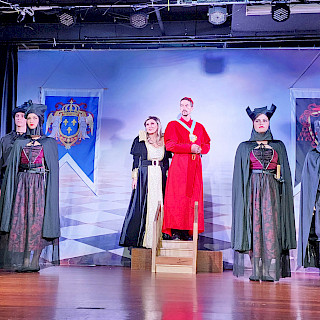Как сказали мне зрители в зале, с которыми я беседовал, все сыграли прекрасно, перевоплощаясь в персонажи и внешне, и по характеру. Нельзя не отметить прекрасно сыгравших Любаву Дмитриеву, Валентину Нечаеву, Анастасию Руденко, неожиданную Ангелину Зайцеву. Ну, а мужчин уж совсем не хочется выделять, все были по-своему хороши... Четверку мушкетеров играли Никита Нечаев, Артем Носовцев, Степан Запевалов, Иван Голузов. Кардинала Ришелье, короля и герцога Бекингема сыграли Максим Гефтман, Даниил Кучеренко и Михаил Куликов.