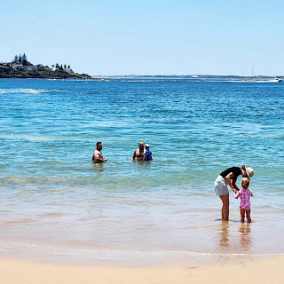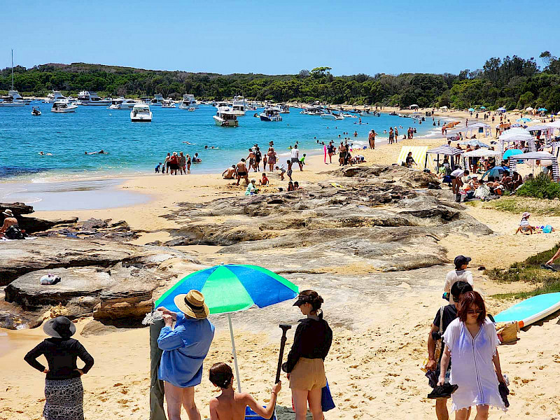 Когда-то лет пятнадцать назад, когда мы здесь побывали в первый раз, нам, кроме красивых пляжей, понравилась тишина и уют этих мест. В этот раз мы приехали перед Новым годом, и город был заполнен туристами, тишину и уют надо было поискать, как и парковку для автомобиля. Мы побывали на двух пляжах - Jibbon и Bundeena. Многих привлекает сюда то, что волны здесь небольшие. Но у нас не было цели лежать на пляже, и мы отправились искать другие красивые места. В конце улицы Short мы нашли прекрасную каменную площадку на мысе Cabbage Tree, откуда открывался прекрасный вид на пляж Horders и на зеленые районы Сиднея, расположенные на другой стороне залива. Здесь же мы видели отправление ферри, идущего из Bundeena в Cronulla. Впервые этот маршрут был открыт в начале прошлого века, и нам показалось, что катер, который мы видели, ходит здесь с тех же времен, старенький, но аккуратный.