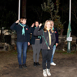 После уборки кухни начинается ВЕЧЕРНИЙ ПАРАД, который как и утренний проходит по всем правилам при построении всего лагеря. Следом идёт одно из любимых развлечений ребят - КОСТЁР. Во время костра мы не только поём скаутские, русские народные, бардовские и современные песни, но также любой желающий может выступить со своим номером. Ребята поют, играют на различных музыкальных инструментах, показывают маленькие сценки из скаутской жизни, читают стихи. Наши костры всегда проходят весело и интересно. В этот раз наш костёр даже привлёк внимание австралийских скаутов, которые расположились лагерем по соседству. Они с удовольствием слушали и смотрели наши номера и даже выступили со своей сценкой.