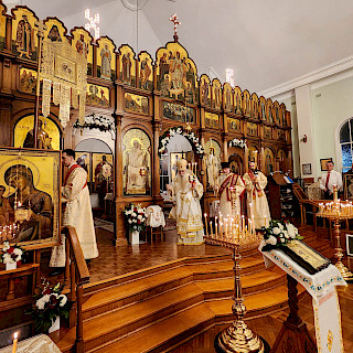 Высоко на колокольне, с которой по тихим улицам Стратфилда разносится радостный звон, загораются яркие буквы «ХВ», Христос Воскресе! «Христос Воскресе» - восклицает и архиепископ Георгий, благословляя народ. Ярко загораются все лампы в храме и начинается утренняя праздничная служба. Настроение у клира и всех прихожан прекрасное и веселое. Обычно в эту ночь люди надевают праздничную одежду, приезжают в собор из самых разных частей огромного Сиднея и окрестных мест - Голубых гор и Центрального берега. Архиепископ, священники и протодиаконы по очереди обходят все части храма поздравляя прихожан и гостей, пришедших на службу в собор, словами Христос Воскресе, по-гречески Christos anesti, и по-английски Christ is Risen!