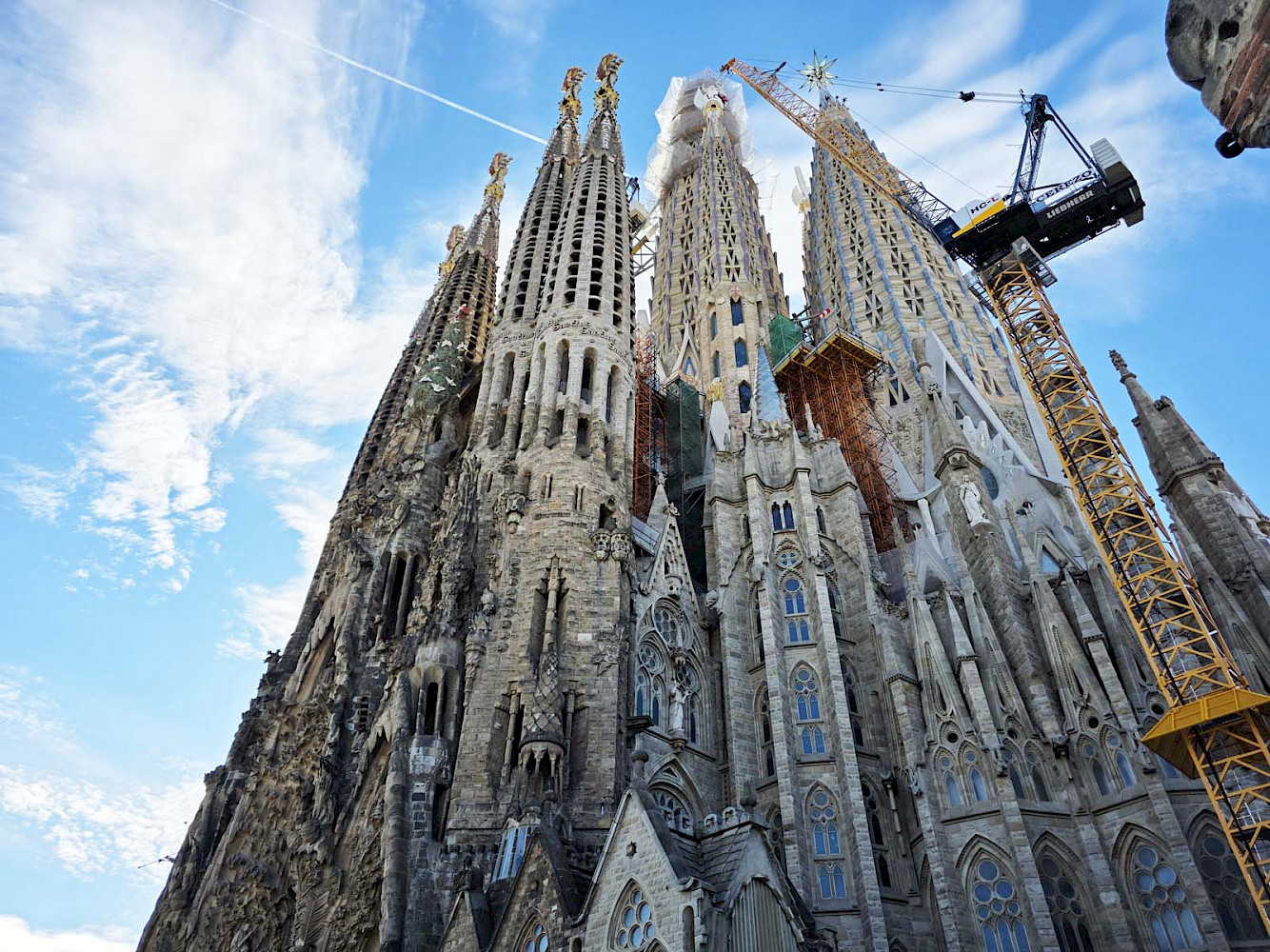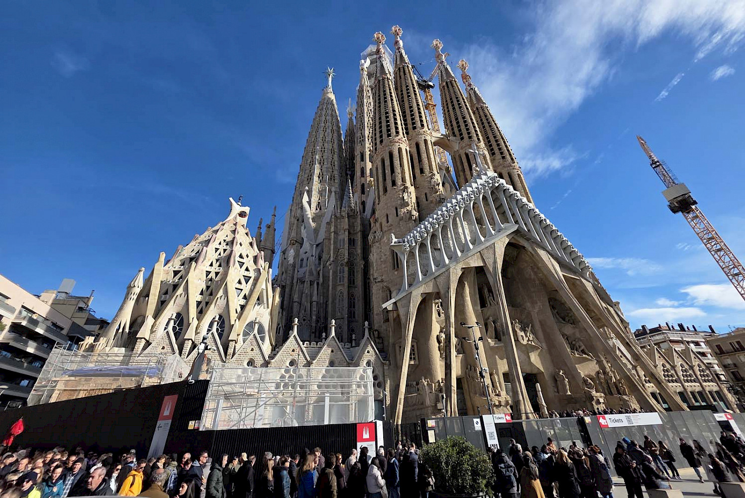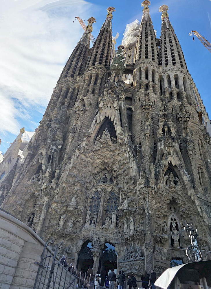 Вторым городом, появившимся для нас очередным ранним утром, была Барселона. Тут мы, конечно, планировали посмотреть знаменитую церковь архитектора Гауди и символ Барселоны Саграда Фамилия, что означает Святое Семейство. Мы на туристическом автобусе объехали весь город, где почти треть времени нам рассказывали про местную футбольную команду, которую местные фанаты называют Барса. Видим это ценность номер один для жителей города, а творения Гауди на втором месте. Впрочем, когда мы вышли у знаменитого храма, мы поняли, что туристов здесь существенно больше, чем у стадиона Барсы. Огромная толпа людей окружала туристическую достопримечательность кругом, подойти близко было нельзя. Хорошо, что большое видится на расстоянии. Мы посмотрели все три фасада. Здание, конечно, впечатляет своей мощью, высотой и разнообразием. Тем более, что в эти дни как раз заканчивали устанавливать кресты на башне и собор стал самым высоким в Европе, почти 163 метра.