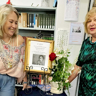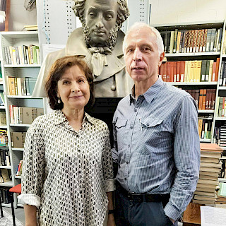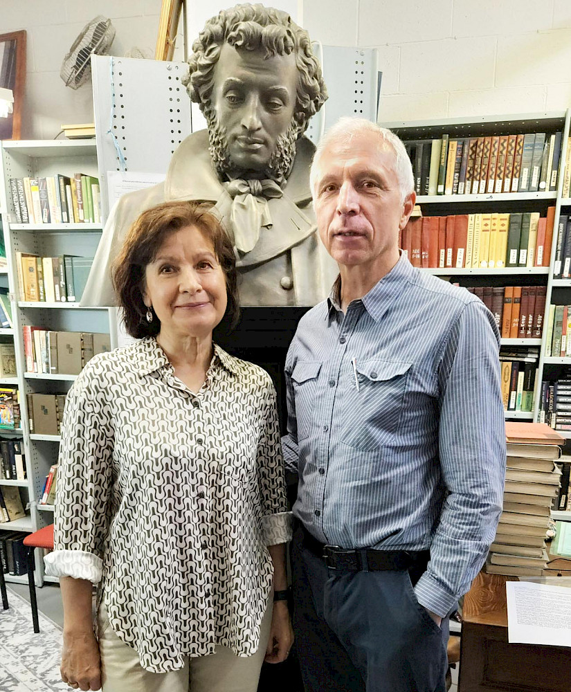 В этот раз к нам пришли Павел и Марина Козловы, которые в прошлом году привезли бюст А.С. Пушкина из Москвы в Сидней. Этот бюст был подарен на столетний юбилей в 2024 году Русскому клубу заслуженным скульптором из России Александром Егоровичем Козининым. Александр Егорович живёт и творит в небольшом городе Калач Воронежской области. Бюст Пушкина необходимо было привезти из Калача в Сидней. Также необходимо было получить официальное разрешение от Министерства культуры Российской Федерации на вывоз из России данного произведения искусств. Это была большая и сложная работа. Павел и Марина Козловы взялись за этот благородный труд. И они всё оформили и доставили бюст Пушкина в Русский клуб Сиднея из Калача в феврале 2025 года! 15 июня 2025 года в Русском клубе состоялось торжественное открытие памятника Пушкину. Об этом событии можно почитать в газете «Единение» по адресу:  https://www.unification.com.au/articles/1750228198/. Мы благодарны Павлу и Марине Козловым за эту большую и трудную работу для Русского клуба. Фотографию  Павла и Марины Козловых рядом с бюстом Пушкина в нашей библиотеке я послала скульптору Козинину с благодарностью.
