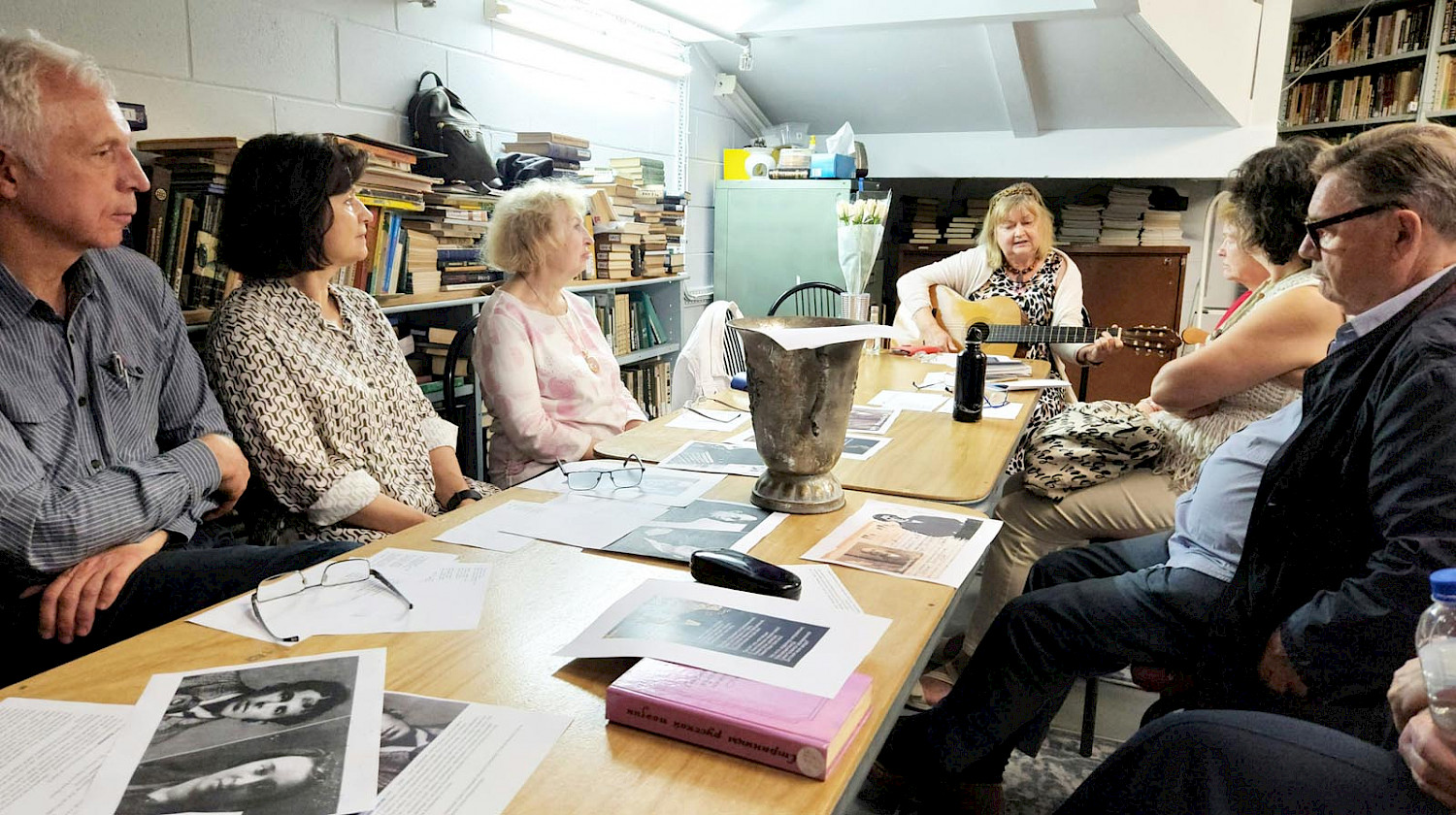 После чтения стихов, в музыкальной части встречи мы слушали нашего замечательного барда Ольгу Толмачёву. Она спела несколько песен на стихи Мандельштама, Ахматовой и играла на гитаре.
