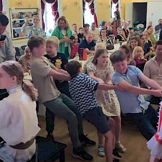 Концерт закончился, а люди не спешили расходиться. Под звуки народных инструментов начался мастер-класс по танцу «Коробейники», который провела Алиса Гантимурова. Молодёжь и дети разучивали движения, смеялись, пробовали вновь и вновь. И вот ребята уже весело исполняют только что разученный танец. Было радостно смотреть на эти счастливые лица нового поколения, стремящегося сохранить русские культурные и духовные традиции на австралийской земле.