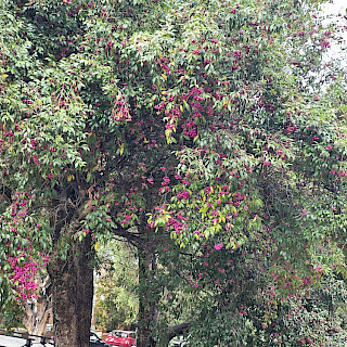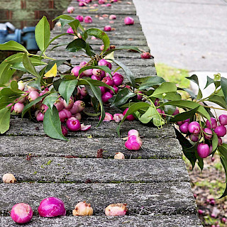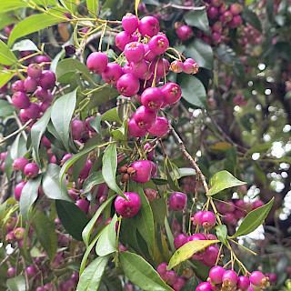 Их кусты используют как красивую живую изгородь, молодые листья растений окрашиваются в алый цвет, а затем, со временем, превращаются в зеленые. А большие деревья часто высаживают в городах вдоль дорог или в парках. И каждый сезон они выделяются чем-то особенным на фоне остальных растений. Или бело-розовыми цветочками или, как сейчас, обильными яркими маленькими плодами, свисающими с веток целыми гроздьями. Название у них немного смешное Лилли-пилли (Lilly pilly), впрочем, по-научному их называют Syzigium.