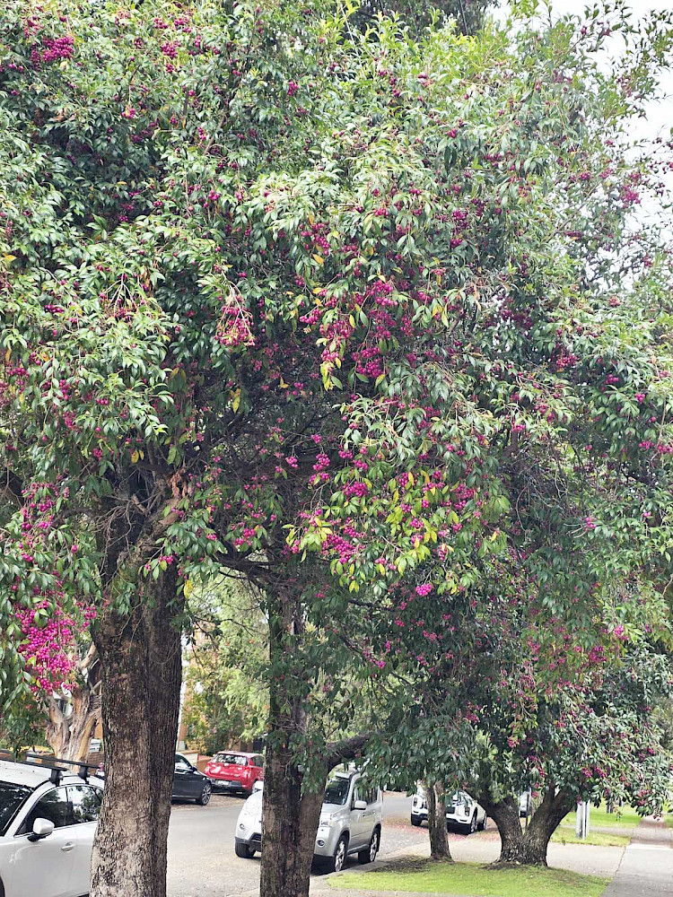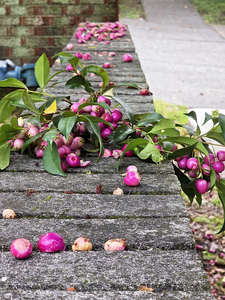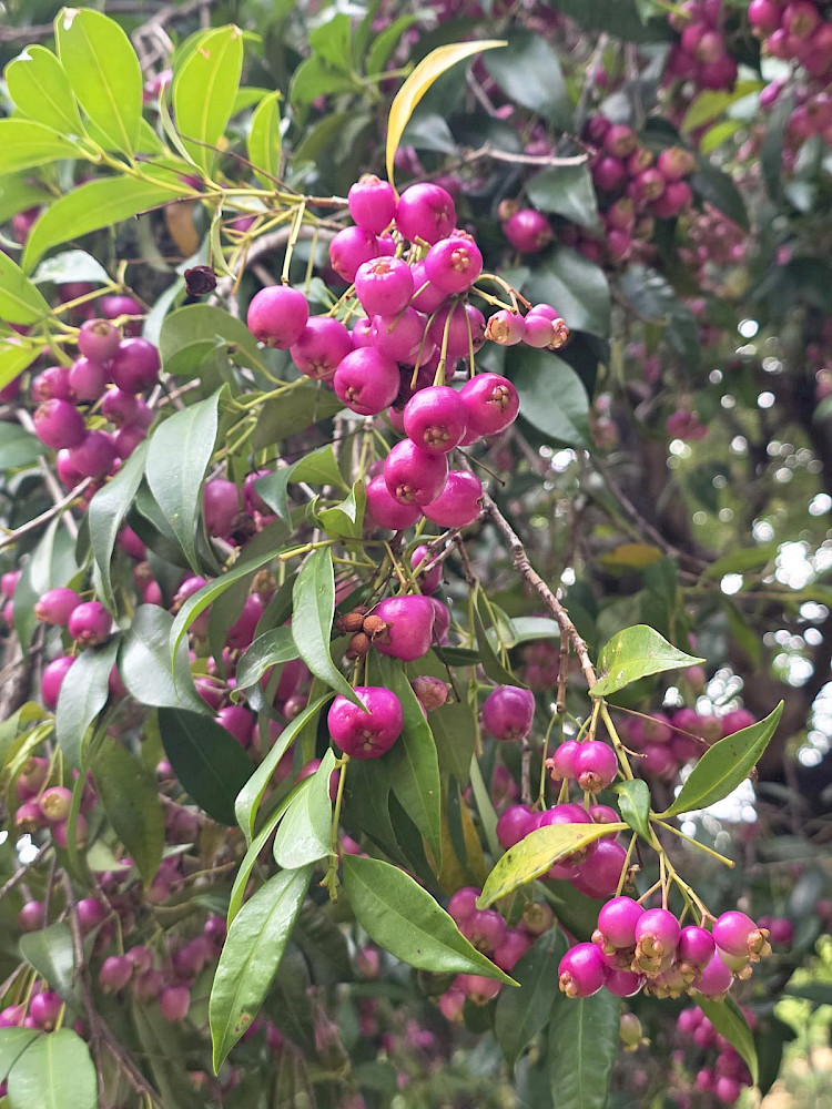 Их кусты используют как красивую живую изгородь, молодые листья растений окрашиваются в алый цвет, а затем, со временем, превращаются в зеленые. А большие деревья часто высаживают в городах вдоль дорог или в парках. И каждый сезон они выделяются чем-то особенным на фоне остальных растений. Или бело-розовыми цветочками или, как сейчас, обильными яркими маленькими плодами, свисающими с веток целыми гроздьями. Название у них немного смешное Лилли-пилли (Lilly pilly), впрочем, по-научному их называют Syzigium.