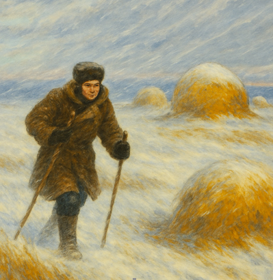 В какой то момент ночью он их потерял из виду. Буря усилилась, и он перестал понимать, где находится. В поиске дороги он наткнулся на стог сена — единственное укрытие в открытой степи. Он забрался внутрь и пробыл там какое-то время. Позже он говорил, что вылез из стога слишком рано, подумав, что буря стихла, но почти сразу был вынужден вернуться. Второй раз укрытие было хуже — отверстие, которое он сделал, пропускало ветер.