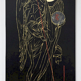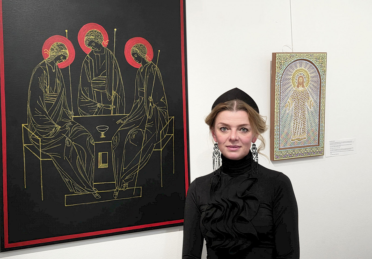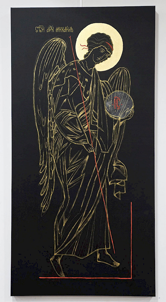 — Да, это абсолютно осознанный выбор. И я бы даже сказала — это часть концепции. В этой выставке представлены два направления, которые на первый взгляд могут показаться разными, но для меня они являются двумя способами говорить об одном и том же. С одной стороны — это икона, раскрытая через цвет. Через сложную систему точечного письма, в которой цвет рождается не на поверхности, а в восприятии зрителя. Через свет, который словно исходит изнутри образа. С другой стороны — это предельно сдержанный язык. Почти полное отсутствие цвета. Линия, форма, лаконичность. И здесь происходит, возможно, самое важное. Потому что, когда исчезает цвет, у зрителя появляется пространство. Пространство для внутреннего участия. Для того, чтобы не просто смотреть, а всматриваться. И в каком-то смысле — завершать образ внутри себя. И в этом моменте икона начинает говорить на языке, который оказывается близок современному искусству. Не через демонстрацию техники. Не через сложность исполнения. А через идею, через состояние, через внутренний опыт. Для меня это не противопоставление традиции и современности. Это попытка найти точку, в которой они могут встретиться. И, возможно, это один из путей, который позволяет православному искусству не только сохраняться, но и выстоять в современном мире — сохраняя свою глубину, но обретая новый язык.