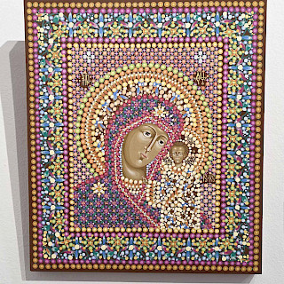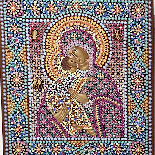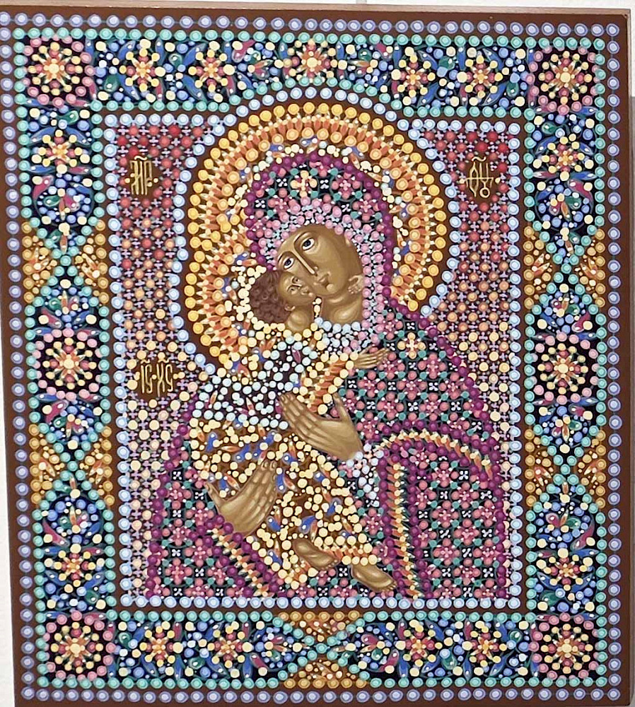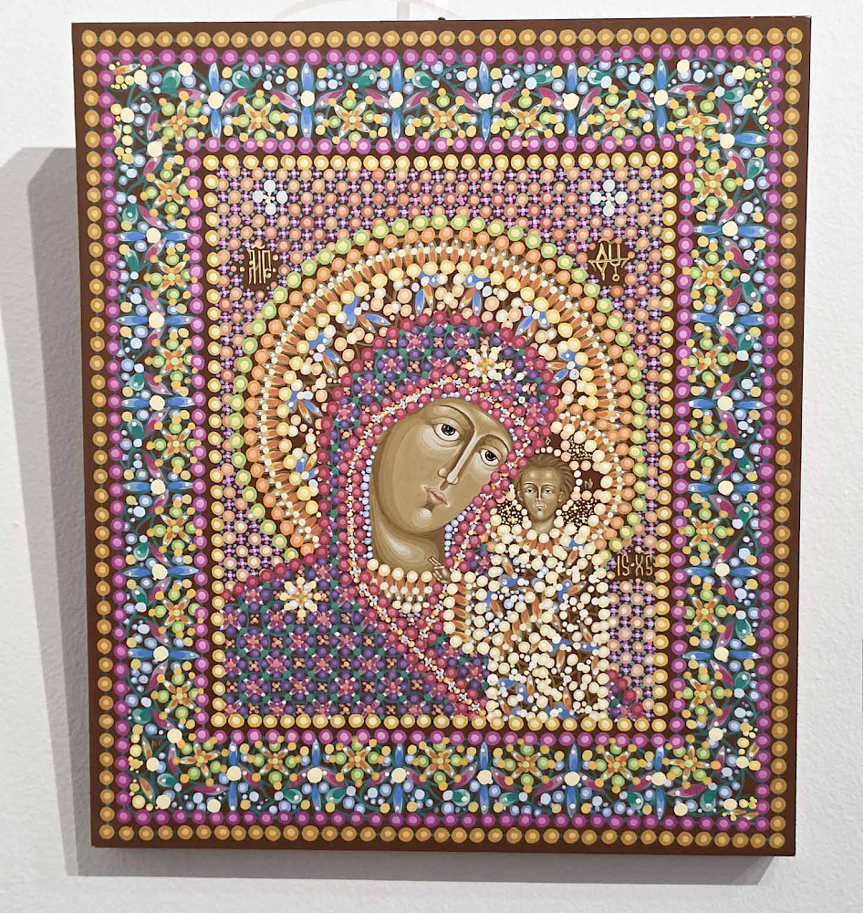 — Да, в каком-то смысле — да. Восприятие становится соучастием. И при этом очень важно, что лики святых пишутся традиционно, строго по канону. А всё остальное пространство — фон, одежды, орнамент — раскрывается через эту точечную живопись. За счёт этого возникает особое внутреннее свечение, которое невозможно получить обычным способом.