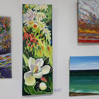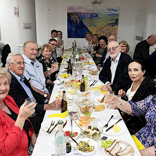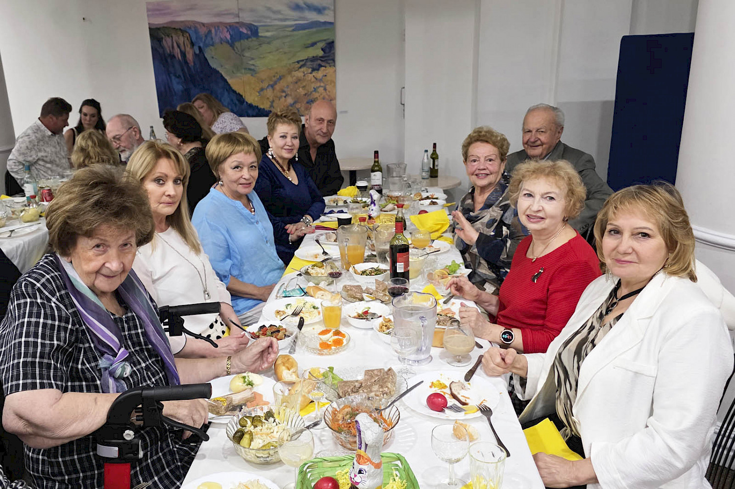 В зале собрались многолетние члены и гости клуба. Приятно провести праздничные дни со своими старыми друзьями под приятную и любимую музыку. Председатель клуба Елена Энгель поздравила присутствующих с Пасхой и поблагодарила организатора встречи Нину Левицкую и Любу Кофман, приготовившую любимые всеми многочисленные русские закуски и сибирские пельмени. Многие гости с интересом рассматривали картины наших художников, выставленные в зале.