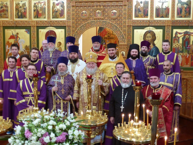 Утром в воскресенье встать пришлось раньше, так как в 8 утра большой автобус повёз молодёжь в Св.Покровский обор на архиерейскую службу. В 9.30 присутствующие встретили митрополита Илариона, которому сослужили на литургии настоятель собора прот.Николай Карыпов, прот.Николай Далинкевич, прот.Пётр Шеко, прот.Владимир Бойков, прот.Борис Игнатьевский, игум. Христофор (Вахабов), иерей Симеон Кычаков и иеромонах Кирил (Гарвас) при протодиаконах Василии Козулине, Александре Абрамове и диаконе Емиле Мишрики. На малом входе Владыка возвёл о.Симеона Кычакова в сан протоиерея, а протодиакона Александра Абрамова наградил правом ношения камилавки. Проповедь, по поручению Первоиерарха, сказал игумен Христофор. К соборному хору присоединилась большая группа певчих из молодёжи.