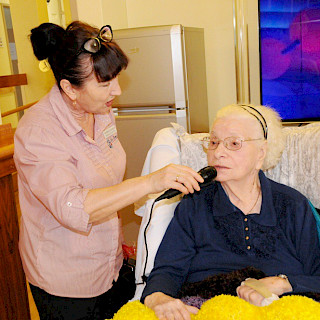 Во-первых, мы создаем индивидуальные музыкальные программы для конкретных наших жителей. Например, у нас живет один человек — большой любитель классической музыки. Мы поговорили с ним и выяснили, что он, оказывается, обожает произведения Баха и Шопена, а вот Моцарта не любит. Мы нашли и купили в музыкальных магазинах композиции именно любимых им композиторов. Наши сотрудницы отдела развлечений, которые после обеда проводят индивидуальные занятия, заходят к нему в комнату с переносным проигрывателем и включают его любимую музыку. Он надевает наушники и с радостью слушает её.