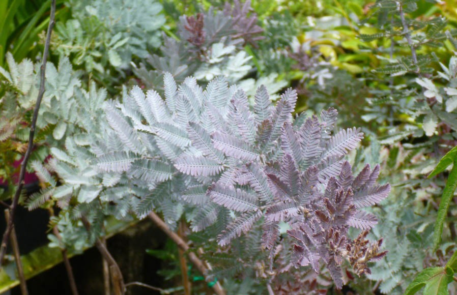 У акаций очень интересная листва — например, молодая листва фиолетовая, а не зелёная у Cootamundra Wattle (Acacia baileyana’Purpurea'), бронзовая у Copper Tips, золотистая у Lime Magic и закрученная у Fettuccini. Листья многих акаций, в ботаническом смысле, даже и листьями не являются — это филлодии, они устойчивы к потере влаги, что делает акацию практически идеальным растением в условиях засушливого климата.
