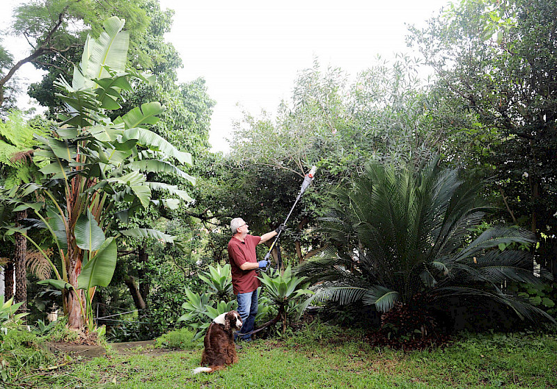 Когда пришел карантин, я не удержался и купил электрическую пилу на длинной двухметровой трубе, чтобы с земли можно было срезать небольшие ветки, толщиной не больше 15 сантиметров, что должно уберечь меня от очередного посещения местных властей.