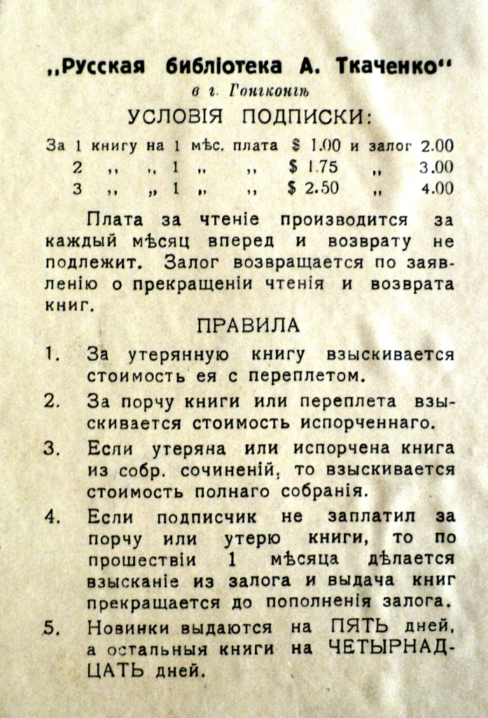 Но сейчас, хотелось пару слов написать о другой библиотеке, сегодня почти забытой, русской библиотеке в Гонконге. Как-то просматривал некоторые свои старые книги, которые получил в дар от знакомых, и обратил внимание, что на некоторых из них стоит круглый библиотечный штамп на титульном листе, а также на других страницах и по традиции — на 17-ой — штамп библиотеки Ткаченко в Гонконге. Ничего об этой библиотеке я раньше не знал и решил провести небольшое расследование. Связался со знакомыми в Гонконге, поработал с Австралийским национальным архивом, полистал альбом В. Д. Жиганова «Русские в Шанхае», разыскал родственников Ткаченко.