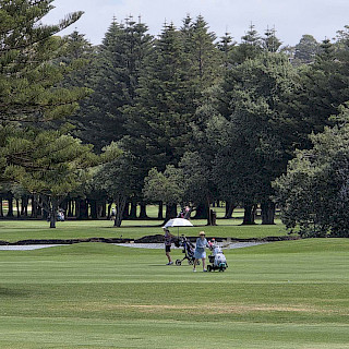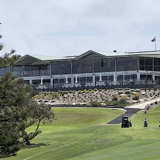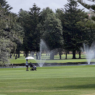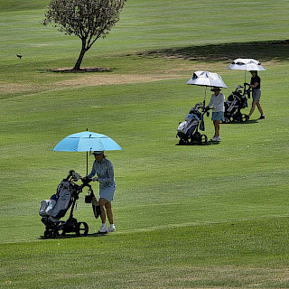 А если заглянуть за 180 градусов моря, то открывается не менее прекрасный вид на ухоженное огромное поле для гольфа, с идеальным травяным покрытием, небольшими озерцами и фонтанами, по которому бродят под зонтиками игроки с тележками на колёсах для клюшек.