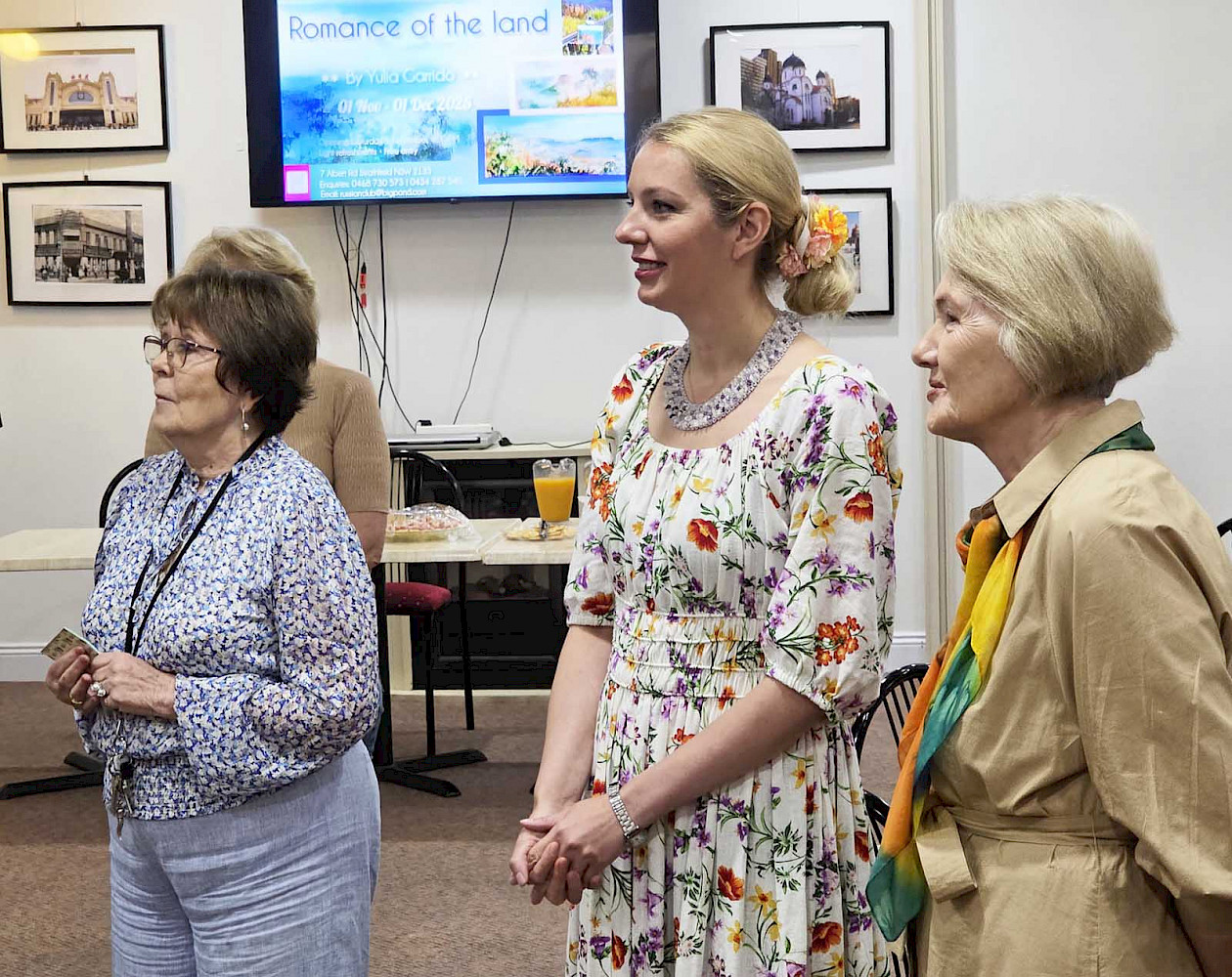 Вице-председатель клуба Елена Энгель приветствовала большую группу гостей, собравшихся на эту встречу. «Около трех лет назад, мы здесь в Русском клубе создали картинную галерею, где художники могут выставить свои работы. Часть картин были куплены нашими посетителями и сейчас украшают их дома. Недавно мы провели первую персональную выставку Евгения Филаретова и вот сейчас открывается выставка Юлии Гарридо. Мы будем продолжать поддерживать художников и в дальнейшем. И не только наших русских, но и австралийских художников. Мы планируем также, чтобы Юля в следующем году проводила в клубе регулярные занятия по живописи».
