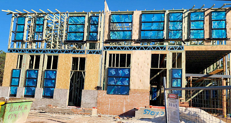 Год назад я гулял утром по нашему району и сфотографировал строящийся дом. Такой, наиболее типичный для современной Австралии, так называемый, brick veneer, то есть с деревянным каркасом, а обшивка наружных стен проводится кирпичом. Позже, гуляя в этих местах замечал, как не спеша строительство продвигалось вперед. И вот сегодня вижу, дом готов, строители поливают уложенные блоки травы у дома, видимо, готовят к продаже.