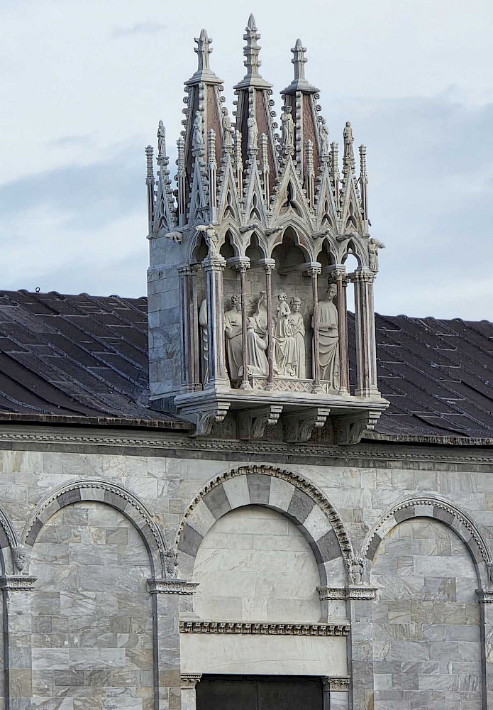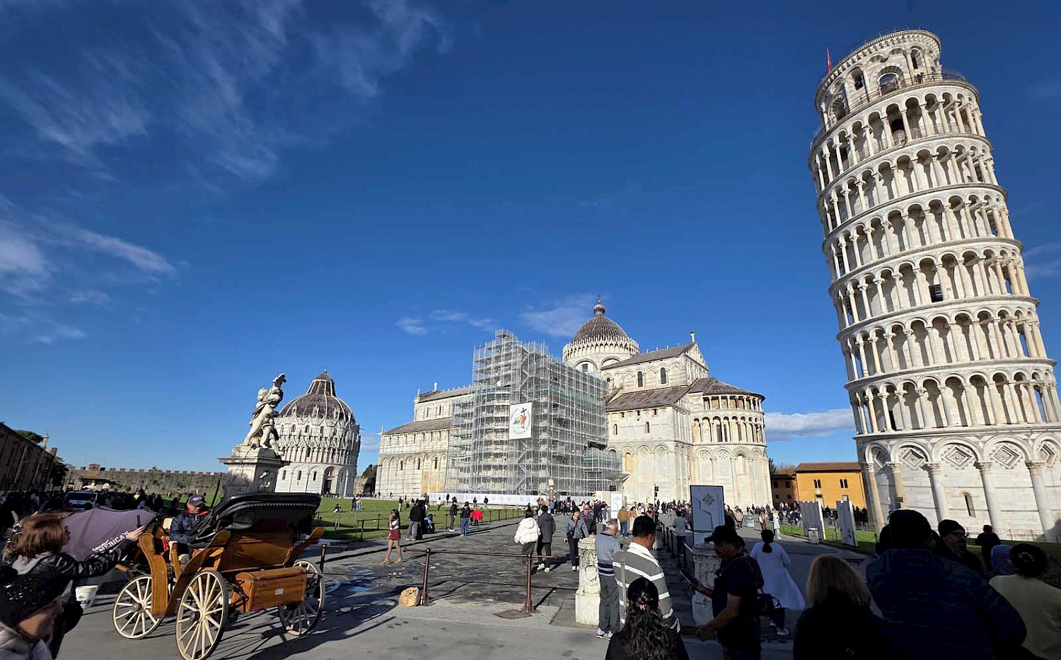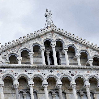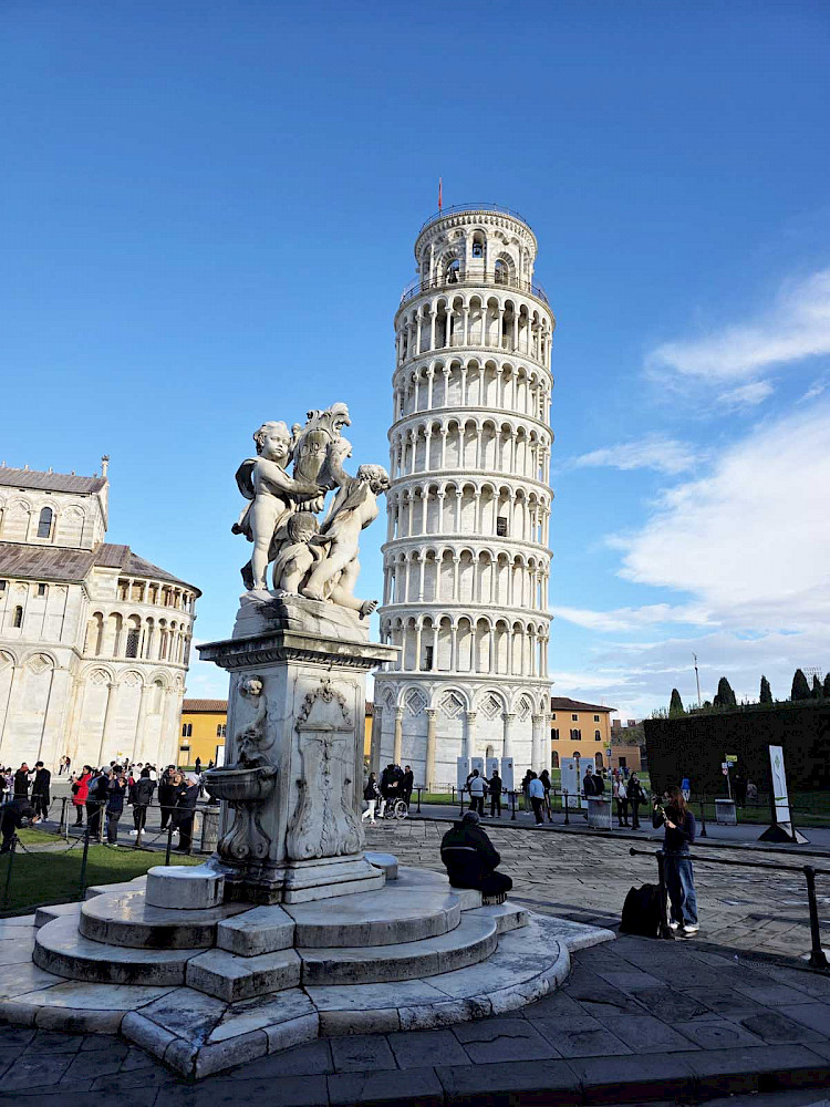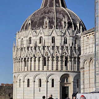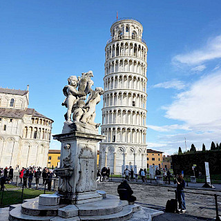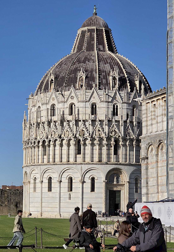 Городок небольшой и осмотр падающей башни, находящегося рядом собора и баптистерии занимает пару часов. За это время все туристы выстраиваются для фотографии, подняв руки, как будто поддерживая наклонившуюся башню - колокольню. Может поэтому мраморная башня, высотой чуть больше 50 метров, несмотря на наклон, до сих пор стоит вот уже почти 900 лет. Начали строить ее в 1173 году. В этом месте проходило второе русло реки Арно, и песчаная почва не очень подходила для строительства высокого здания. Но инспекция в строительстве в древние времена была, очевидно, недостаточной. Когда начали строить – поняли опасность и пытались исправить наклон постройкой более высоких этажей с южной, просевшей стороны. Но башня продолжала наклоняться, и в конце прошлого века пришлось укрепить фундамент, остановивший дальнейший наклон и даже чуть-чуть выправив его, хотя и не сильно. А то, как бы удавалось привлечь такое число туристов в этот небольшой городок? Интересно было побывать в Баптистерии, крупнейшем в Италии здании храмового комплекса, построенном специально для крещения. В нем крестили Галилео Галилея, родившегося в Пизе в 1564 году. Когда он стал знаменитым астрономом, то поддержал идею гелиоцентричной системы мира, то есть, что Земля вращается вокруг Солнца, и был осужден за это католической церковью. Но не стал с ними спорить, поэтому сохранил голову, хотя и попал под домашний арест до конца жизни.