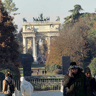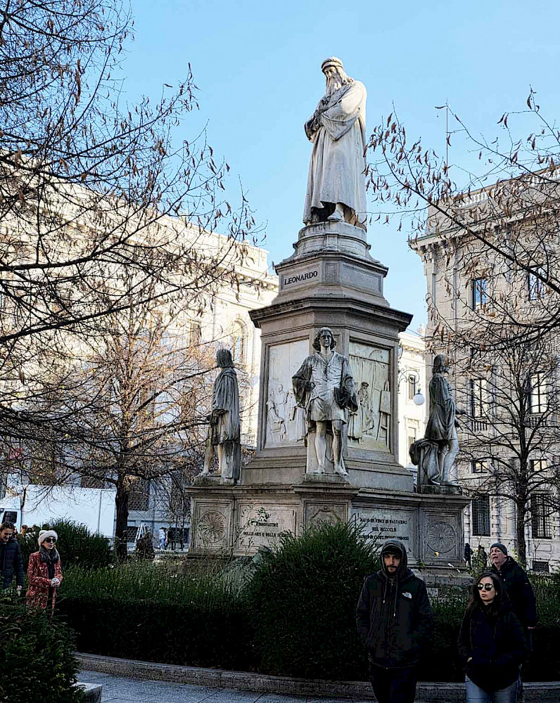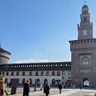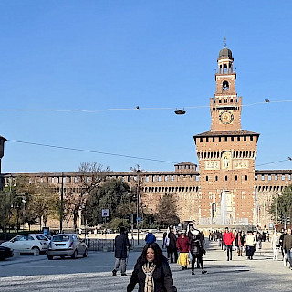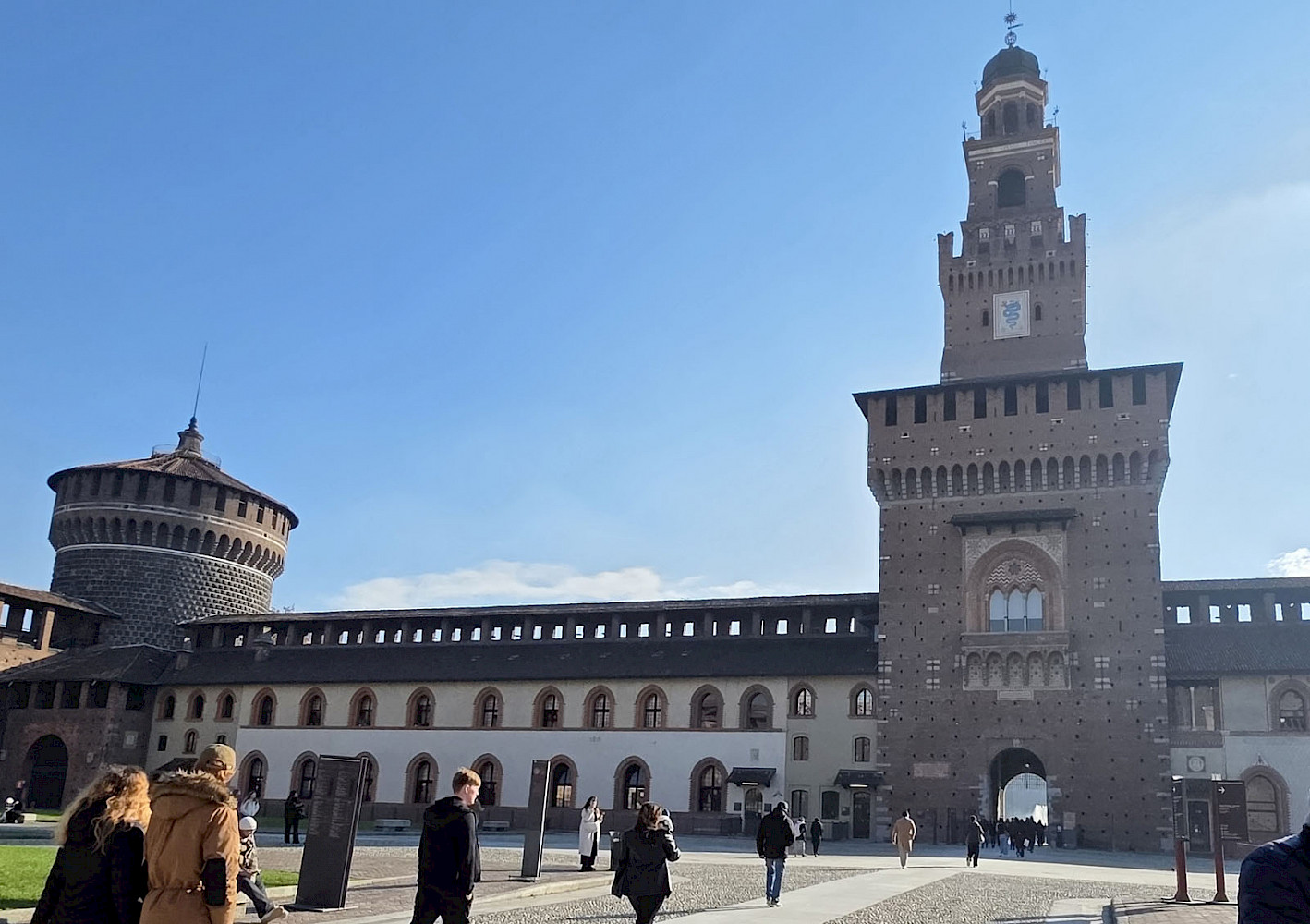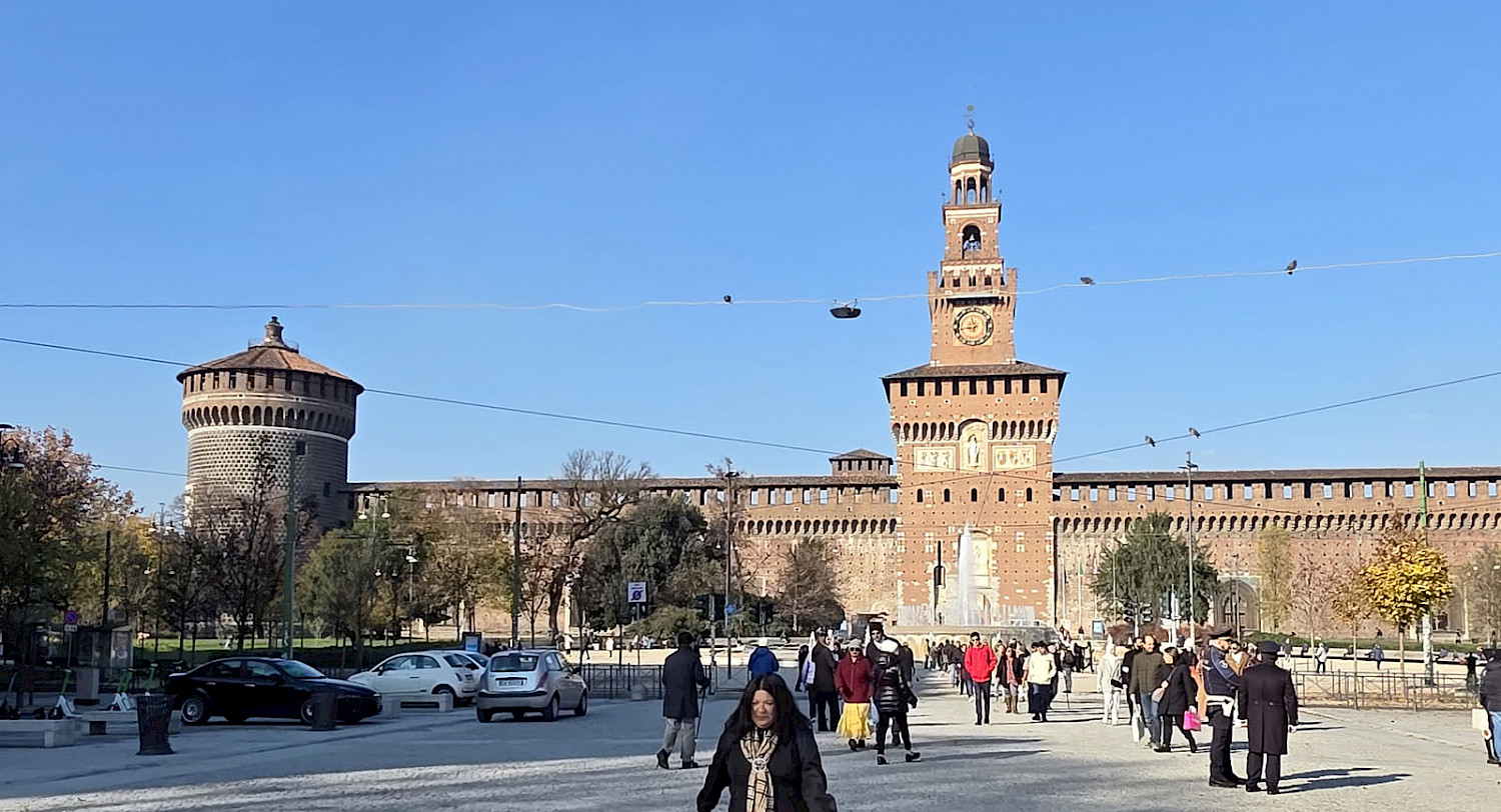 Мы проехали вдоль уютных, еще зеленых, несмотря на конец ноября, маленьких итальянских городов, остановившись у старинного кирпичного замка Сфорца Castello Sforzesco в центре Милана. В этих местах, в отличие от Флоренции и других итальянских городов, не было рядом месторождений мрамора, поэтому башни и стены были выстроены в 15 веке из кирпича. Внешний вид старинных стен напомнил мне Московский кремль, и неудивительно. Ведь кремлевские стены и башни были выстроены по распоряжению Ивана III в те же времена с помощью итальянских архитекторов Аристотеля Фиораванти, Пьетро Солари, у которых учились русские мастера. Внутри замка есть росписи Леонардо да Винчи, этот мастер провел в Милане около 20 лет, работая на герцога Людовико Сфорца, владельца замка, создав здесь свои шедевры «Тайная вечеря» и «Дама с горностаем».