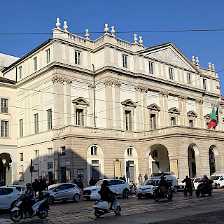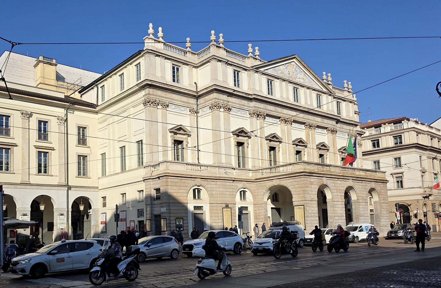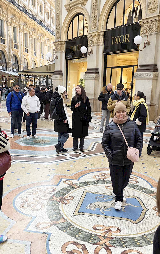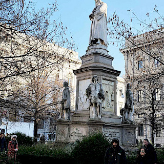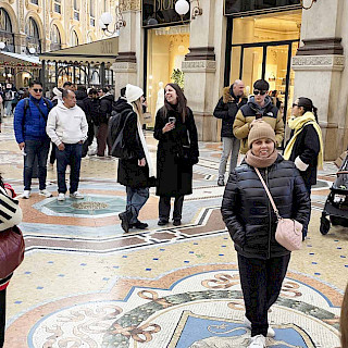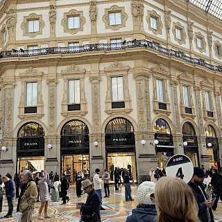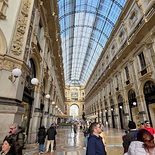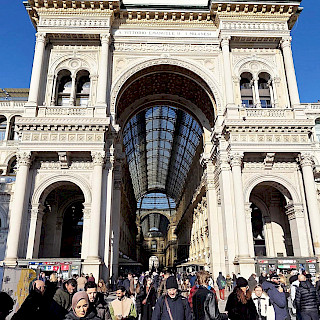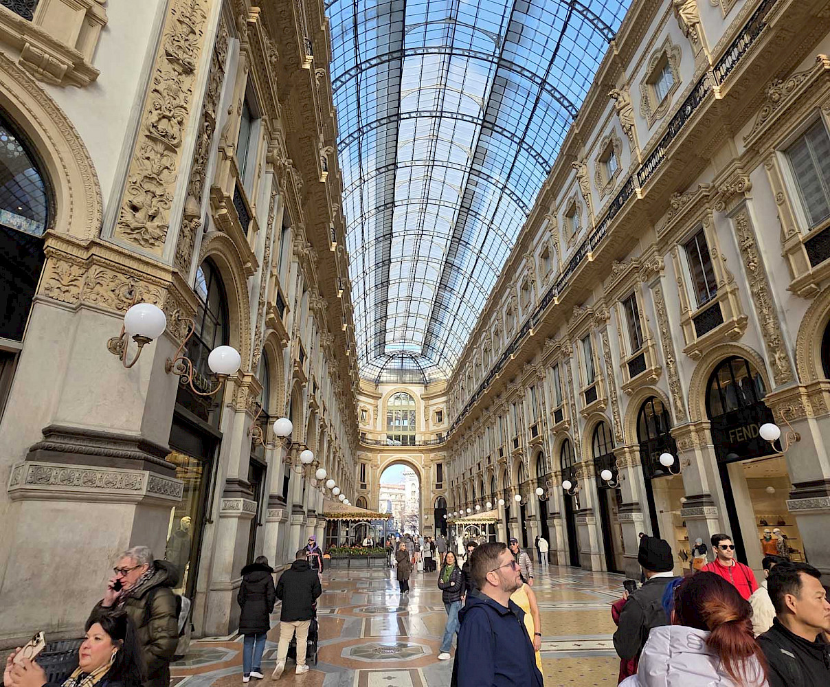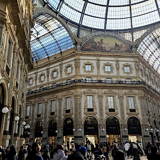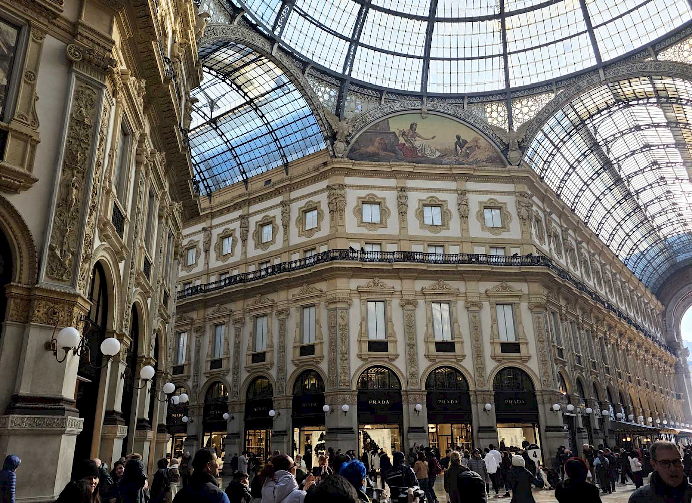 Конечно, находясь в Милане ограниченные четыре часа, мы не смогли обойти весь центр города, но многие достопримечательности нам удалось посмотреть. Мы постояли рядом с театром La Scala, внешне здание не производит особого впечатления, к сожалению, побывать внутри нам не удалось, а ведь это один из самых престижных оперных театров мира, здесь пели Энрико Карузо, Федор Шаляпин, Мария Каллас. Побывали мы и в знаменитом торговом центре Galleria Vittorio Emanuele II, чтобы почувствовать, почему Милан называют столицей моды. Галерея действительно красивая. Правда планов покупок у нас не было, а гид рассказала, что цены в галерее заоблачные, как и её стеклянная крыша, и тем, кто хотел сделать покупки – порекомендовала магазины на соседних улицах.