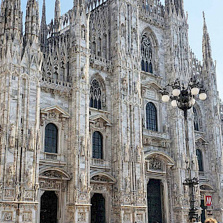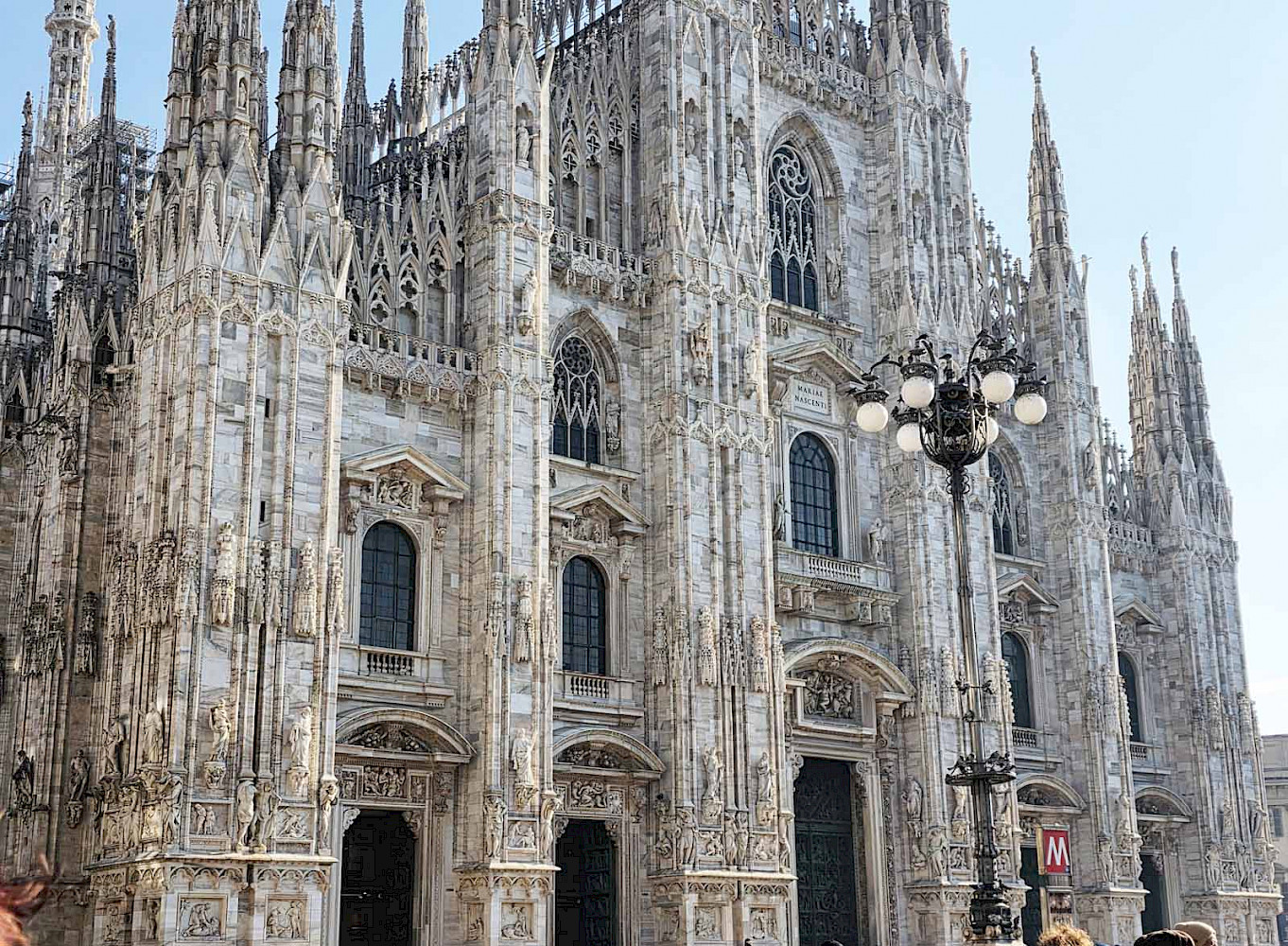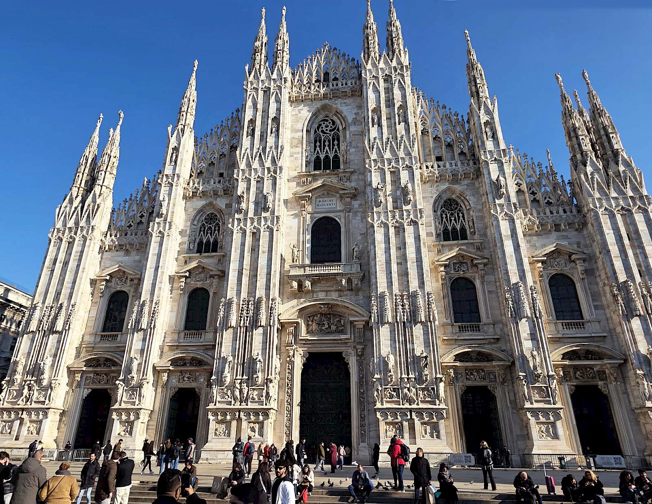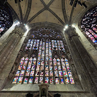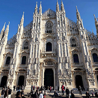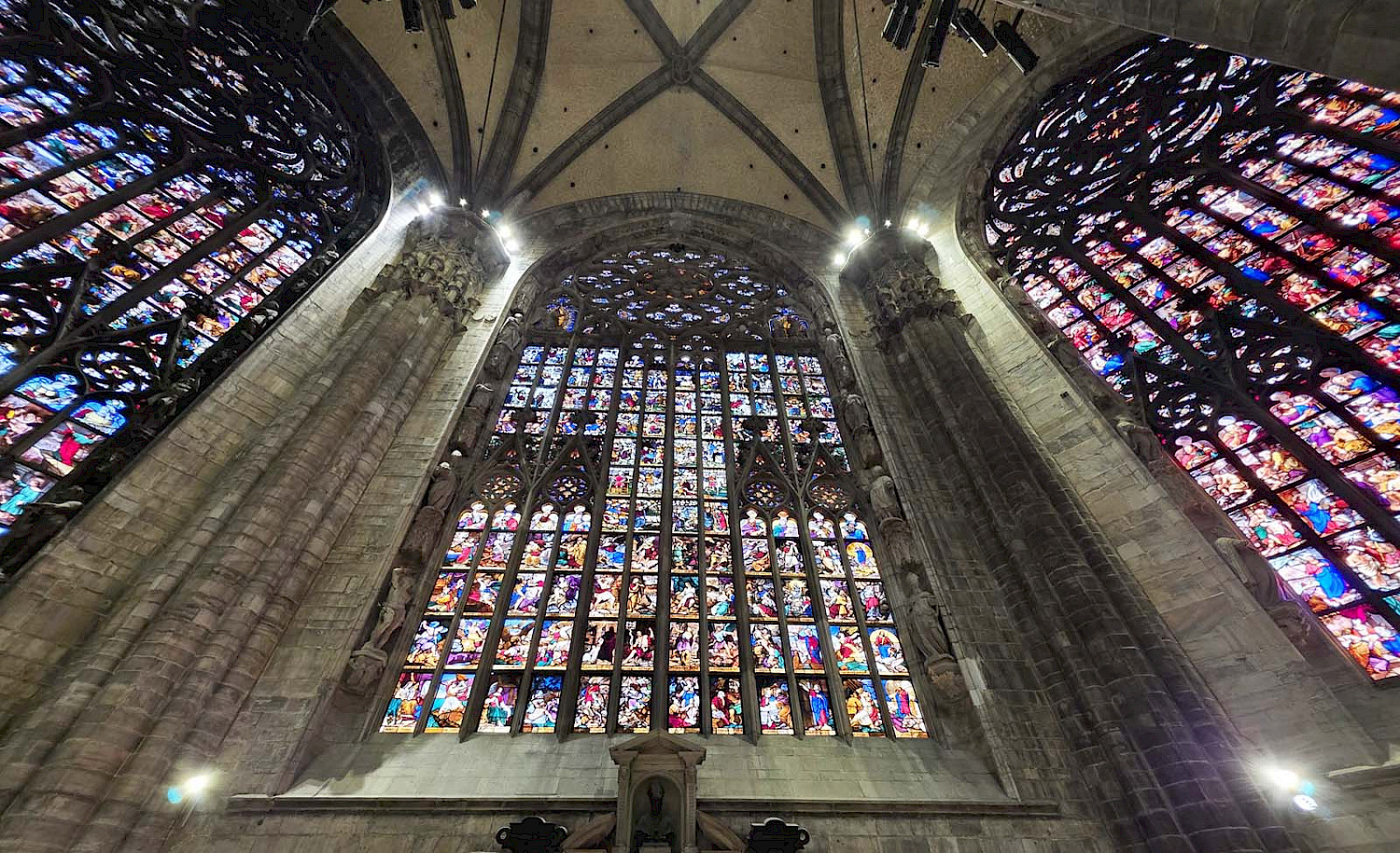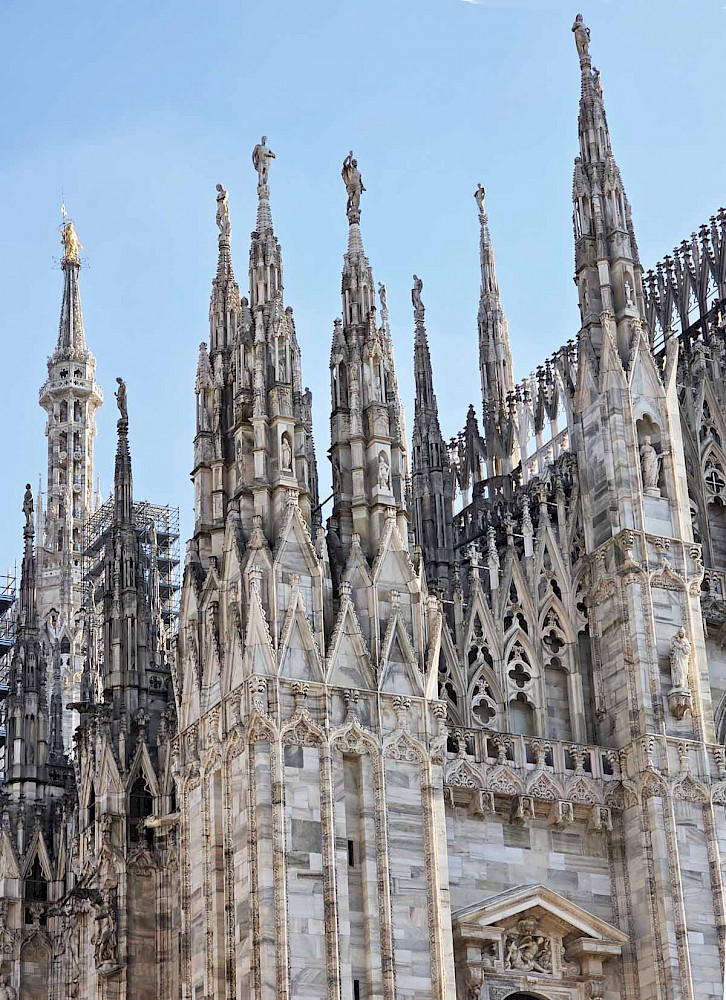 Нас, в первую очередь, привлекал расположенный недалеко знаменитый готический Миланский собор. Собор Дуомо третий по величине в Европе, его высота 108 метров. И один из самых красивых на мой взгляд. В отличии от замка Сфорца, строителям собора удалось найти для стен белый мрамор. Строили долго, с 14 по 20 век, но зато и результат поражает своей отточенностью линий, элегантностью, многочисленностью шпилей и величием. А какие витражи сложные внутри!