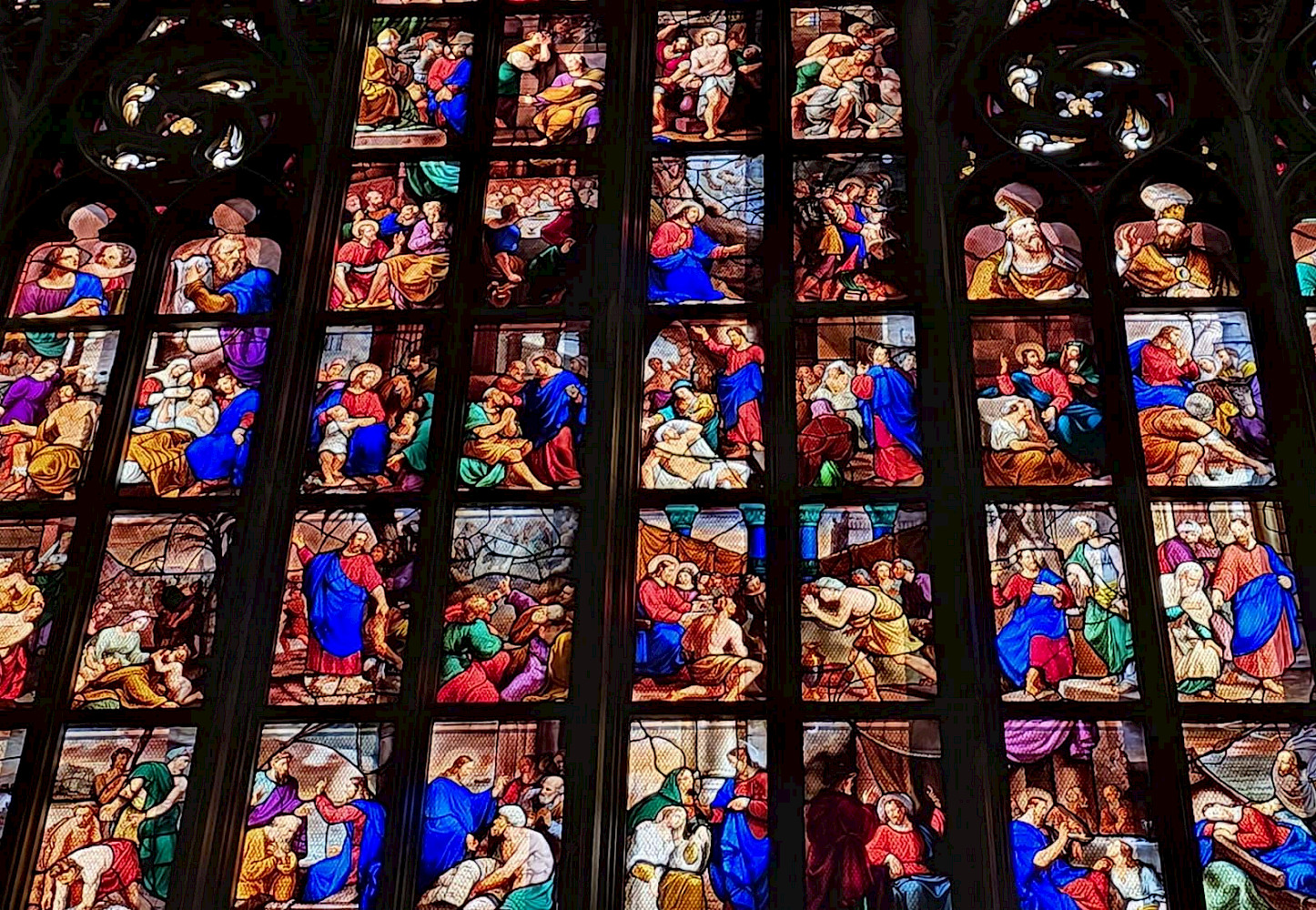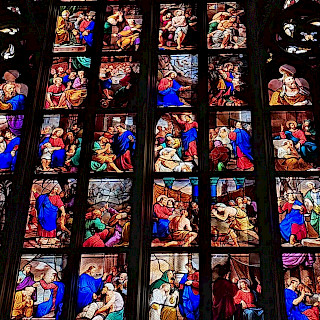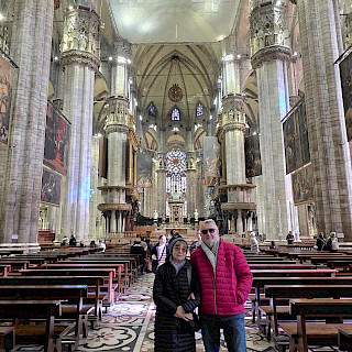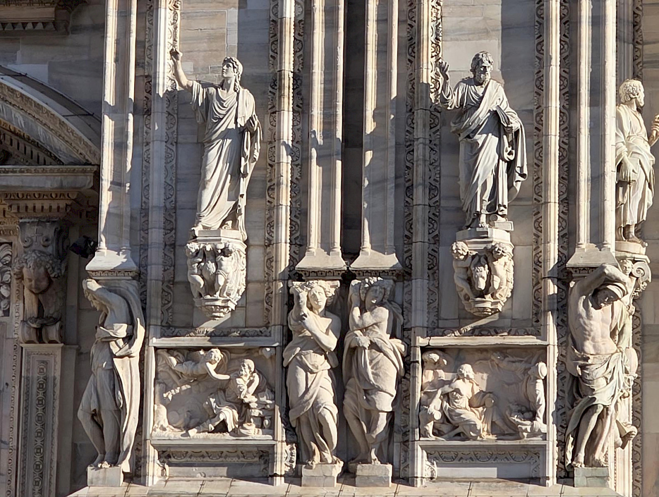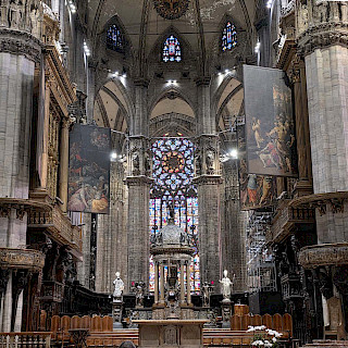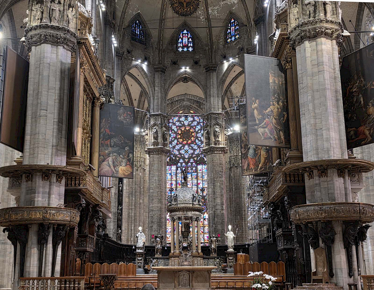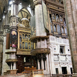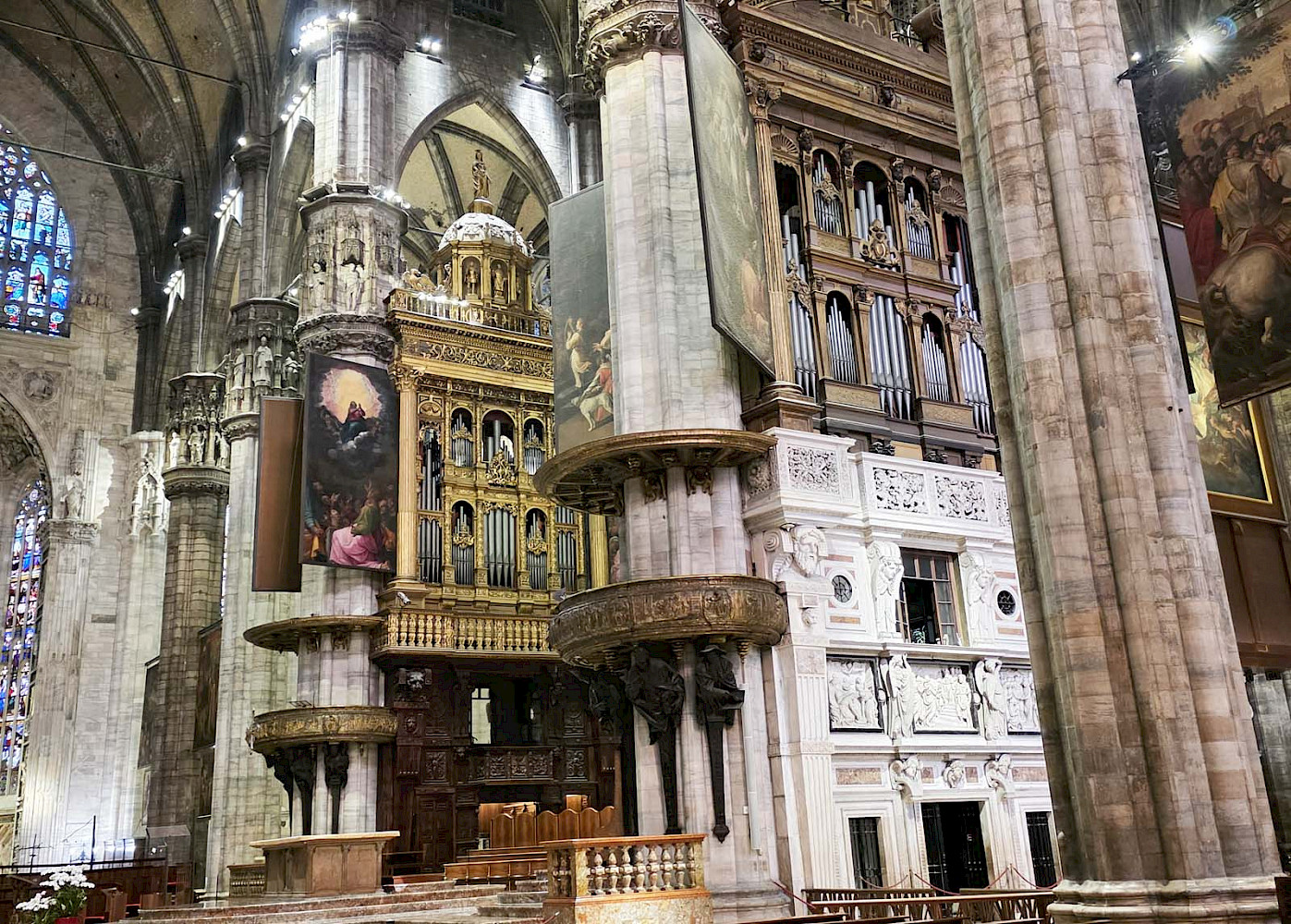 Нас, в первую очередь, привлекал расположенный недалеко знаменитый готический Миланский собор. Собор Дуомо третий по величине в Европе, его высота 108 метров. И один из самых красивых на мой взгляд. В отличии от замка Сфорца, строителям собора удалось найти для стен белый мрамор. Строили долго, с 14 по 20 век, но зато и результат поражает своей отточенностью линий, элегантностью, многочисленностью шпилей и величием. А какие витражи сложные внутри!