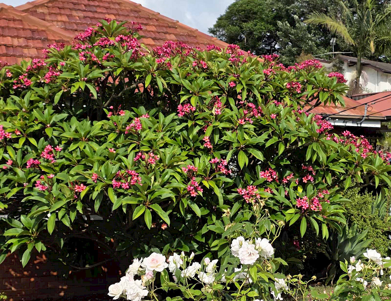Начнем с цветов или, точнее, с деревьев. На переднем дворе одного из соседних домов покрылось очаровательными розовыми цветами красивое дерево Frangipani. Аромат его цветов сладкий, тропический, с оттенками жасмина и цитрусовых. Кто-то назвал его «сладкий соблазн тропический ночи». Эти невысокие деревья часто сажают под окнами, чтобы спастись от летней жары. В Австралии большинство деревьев стоят зелеными круглый год, франжипани другие. Зимой они стоят без листьев, и ветки, как толстые растопыренные пальцы, не мешают проходить зимнему приятному солнцу, но, когда приходит летняя жара, они настоящее спасение. Да и красивы, что сказать. Более обычные – бело-желтые цветы, ну а розовые - просто встреча с радостью.