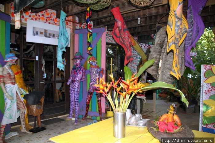 В ноябре 2002г. из Сиднея я отправилась в круиз по близлежащим островам. Следующим и последним портом после Нумеа была вануатская столица Порт-Вила. Рассматривая в каюте туристические брошюрки о ней, я обратила внимание на рекламу магазина двух художников - «Michoutouchkine & Pilioko». Подумала тогда – «Надо же, и сюда наших занесло… Наверно господа из новых русских… Правда один должно быть хохол - Пилиоко или Пилиглаз вполне украинская фамилия». Про себя решила, что нужно будет обязательно туда зайти... Однако была суббота – в знойной и влажной Виле все магазины были уже закрыты. Витрина магазина «русских» поразила тем, что там были выставлены яркие, расписанные одежды, резные фигурки из дерева, редкие вещицы, какие-то обрывки газет и … «мой рисунок». В общем не сетевой магазин и это запомнилось...