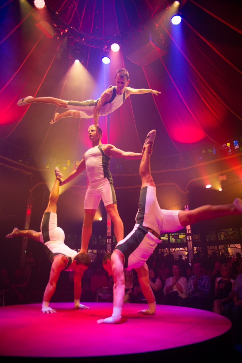Вообще, мы ехали сюда и не знали, как будем работать, сможем ли мы установить турники. Было немного страшно. Мы привыкли к манежу диаметром 10 — 13 метров. А здесь манежа нет вообще, сцена — 2.5 метра в диаметре, проходы маленькие, зритель сидит очень близко. Вообще, это единственный номер гимнастов-турников, который работает на такой сцене в Шпигельтенте.