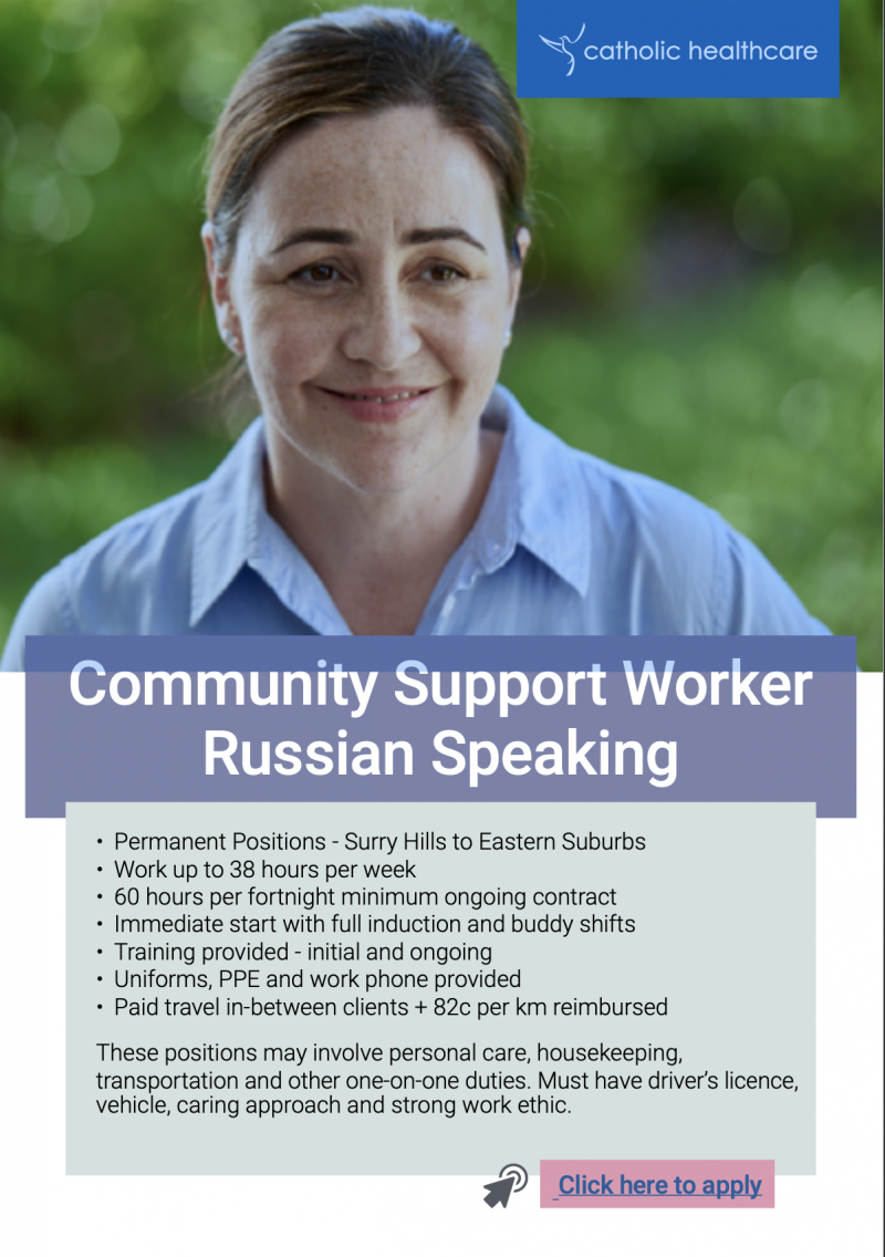 We're looking for a Russian speaking Community Worker in South East Sydney! Build your career with a successful growing Non-for-profit values-based organisation. $20-$30 per hour + Paid Travel + 82c per km reimbursed + Salary Packaging First Aid training nabiog@chcs.com.au